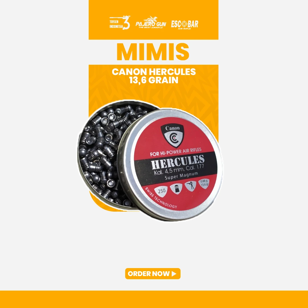 Kuat, Berat, & Mematikan! Pilihan utama bagi para pemburu yang membutuhkan daya hantam (impact) maksimal. Dengan berat 13.6 grain, Canon Hercules dirancang untuk memberikan penetrasi yang dalam dan stabilitas tinggi saat menghadapi angin.